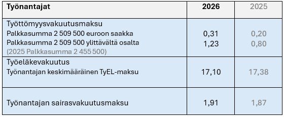 Työntekijä- ja työnantajamaksut vuonna 2026